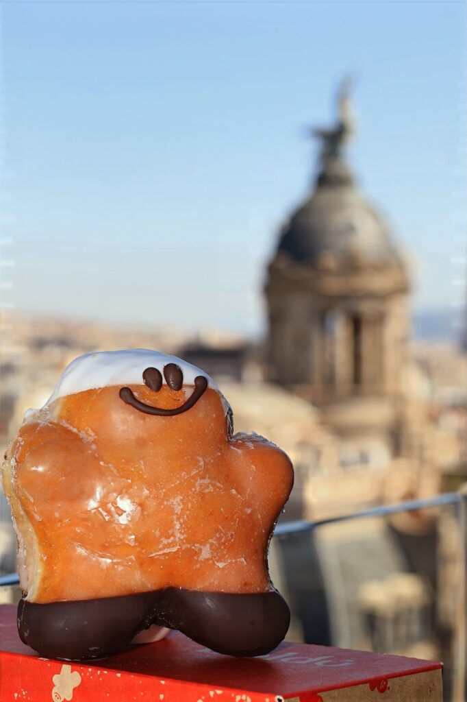To my increasingly normal perch atop an NH Collection hotel, this time the Calderón high above Rambla de Catalunya, I take Boldúman on a journey. Not for a glass of Rioja with a view. Not to mingle with the Gen Z crowd making this skybar their personal VIP section. But to snap a portrait of one delicious little donut dude with a backdrop of the city that embraces him. Then I bite his head off.